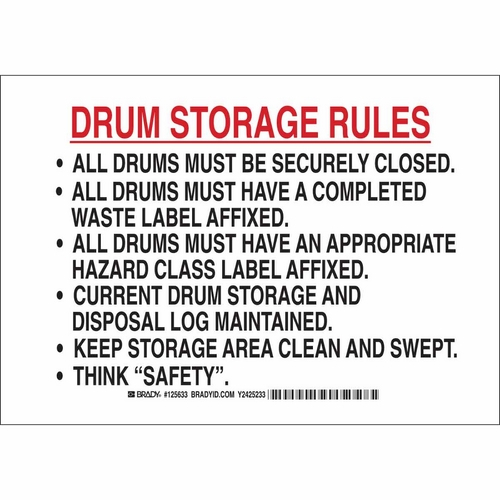 Brady, 125636, 10" x 14" B-302 Drum Storage Rules All Drums Must Be Securely Closed Sign
