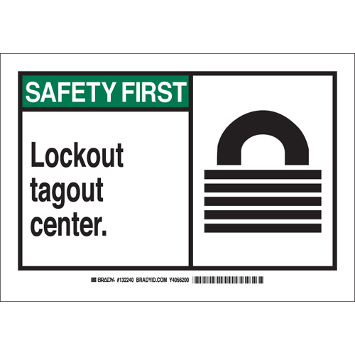 Brady, 132246, 7" x 10" Sign "Safety First Lockout Tagout Center.", Polyester, Black/Green on White