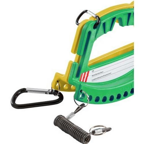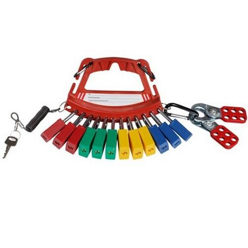 The carrier holds up to 12 safety padlocks and easy attach to belt clips, or the offset design permits flush wall or machine mounting.