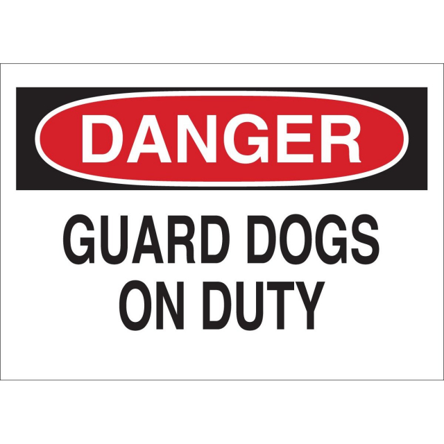 Brady, 22097, 7" x 10" Polystyrene Danger Guard Dogs On Duty Sign, Black/Red on White