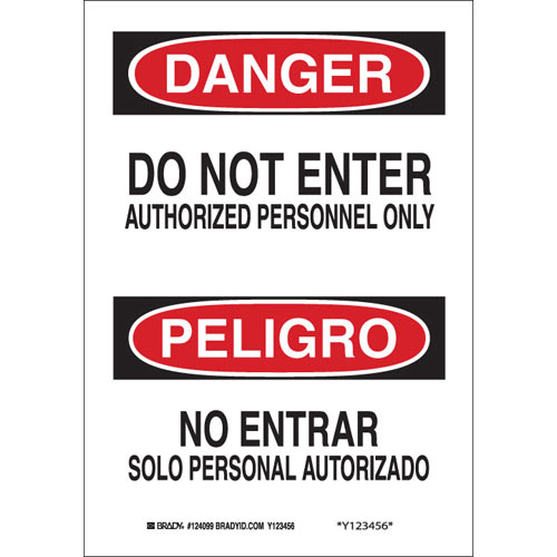 Brady, 38104, 14"x10" B-555 Bilingual Danger Do Not Enter Authorized Personnel Only Sign