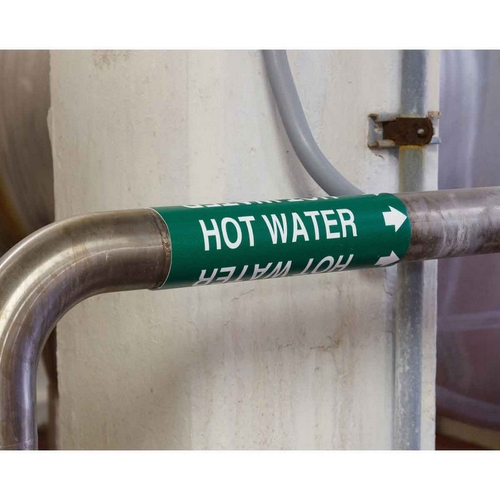 This B-915 pipe marker is designed for use on rusty, dirty, wet, or rough pipes, where pressure sensitive labels cannot be used.