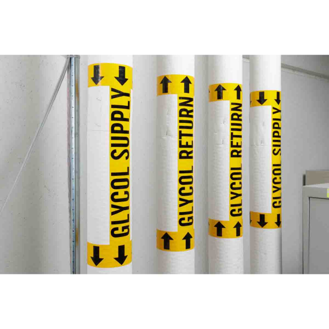 Self-Sticking Vinyl Pipe Markers meet the requirements of the ASME (ANSI) A13.1 Standard for identifying piping system contents when used with Directional Flow Arrow Tape.