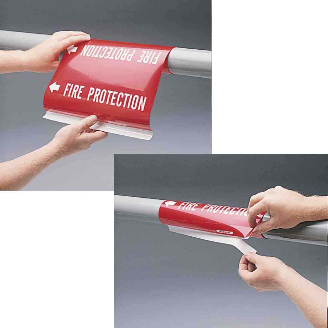 Wrap Around High Performance Pipe Markers (B-689) are coiled, printed plastic sheets with sealed color graphics for use on pipes in harsh environments.
