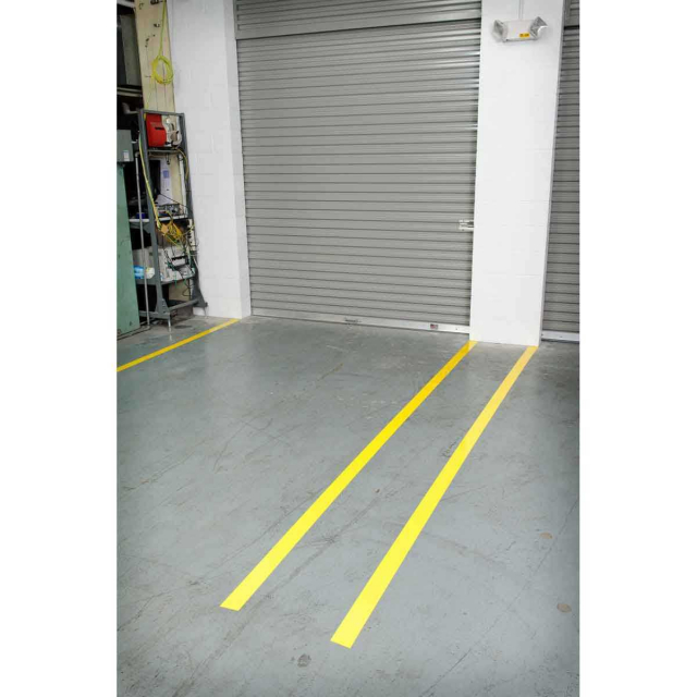 Create custom floor labels using ToughStripe® Ultra Aggressive Polyester (B-483) floor tape with B-634 polyester overlaminate.