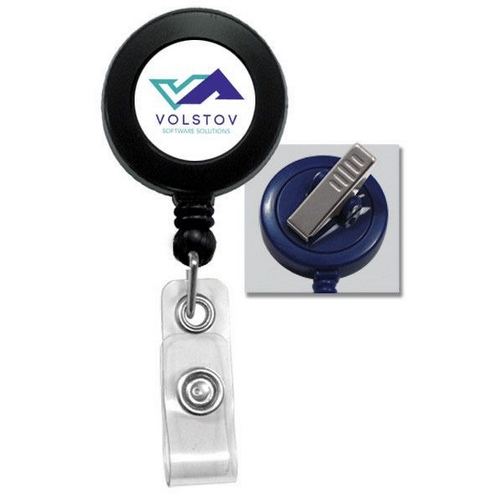 Round badge reel with swivel back, metal clip and clear vinyl strap Reel Dimensions: 1-1/4" (32mm) Cord Length: 34" (864mm)