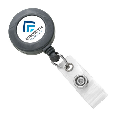 Round badge reel with swivel back, metal clip and clear vinyl strap Reel Dimensions: 1-1/4" (32mm) Cord Length: 34" (864mm)