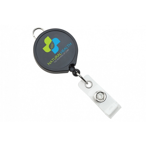 Round solid black plastic badge reel with lanyard attachment (loop) at top, belt clip and clear vinyl strap. Reel Diameter: 1-3/8" (35mm). Cord Length 36" (914mm). Imprint area: 1-3/16" (30mm)