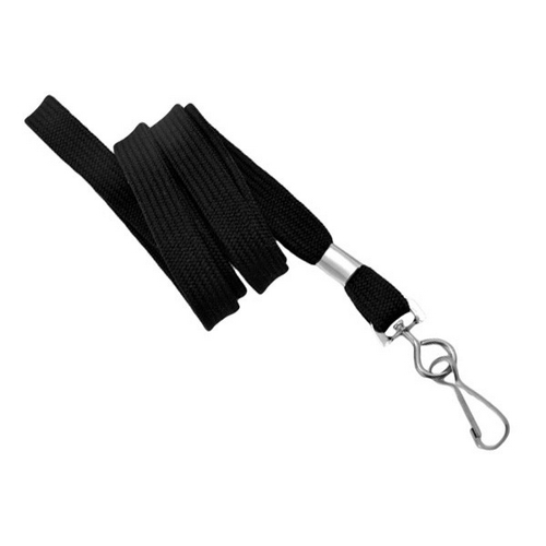 Black 3/8" Flat Non-Breakaway Lanyard With Swivel Hook. Flat Braid Polyester Material Has A 48 Thread Count For A Softer More Comfortable Fit. Includes A Metal Crimp As A Finishing Option.