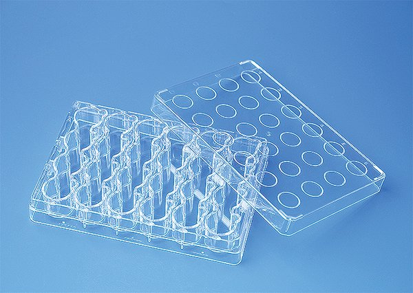 The plate has 6 rows of 4 wells connected as one large, elongated well. This well is fitted with a strip of 4 inserts so that all 4 of the inserts in the strip can be supplied with medium at the same time. Particularly well suited to the use of insert strips with inlet channels.