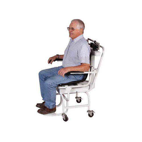 This mechanical chair scale was designed for weighing those who have diffi culty standing on their own. The die-cast easy-to-read beam runs along the back of the chair. Powder coated steel construction. The chair is oversized for comfort with arms and footrest that lift away for easy access. The rear wheels lock for safety and the front wheels swivel for easy portability along with easy to clean plastic seat.