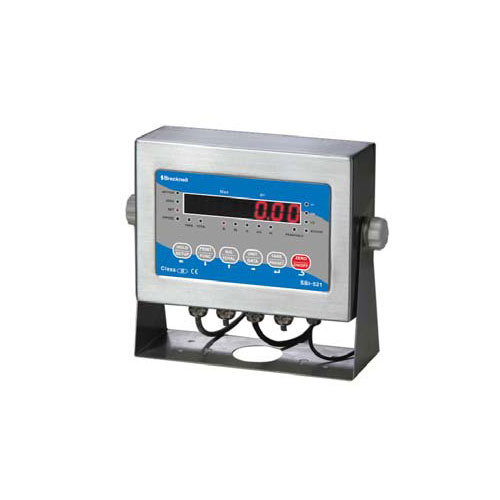 The SBI-521 is NTEP approved for 10,000 divisions, class lll. Available with seven digit, seven segment, 17 mm / 0.7" LED. Two full duplex RS-232 serial port; demand or continuous. Standard features include hold, counting, totalizing, check weighing and percentage. Full front panel confi guration with multi-point calibration up to four points. Built-in non-volatile real time and date. Housed in heavy duty stainless steel IP65 with stainless steel swivel stand. Operates on AC/internal battery (included).
