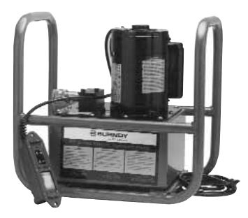 Electrically driven hydraulic pumps are supplied with a durable, hand-held electric pendent switch that remotely controls the pump and matches the output requirements of all Hypress™ remote heads and cutters. Each pump is equipped with a built-in, factory set, pressure relief valve. An audible “pop” and recycling of the pump and relaxing of the hose, signals completion of the crimping/cutting cycle.