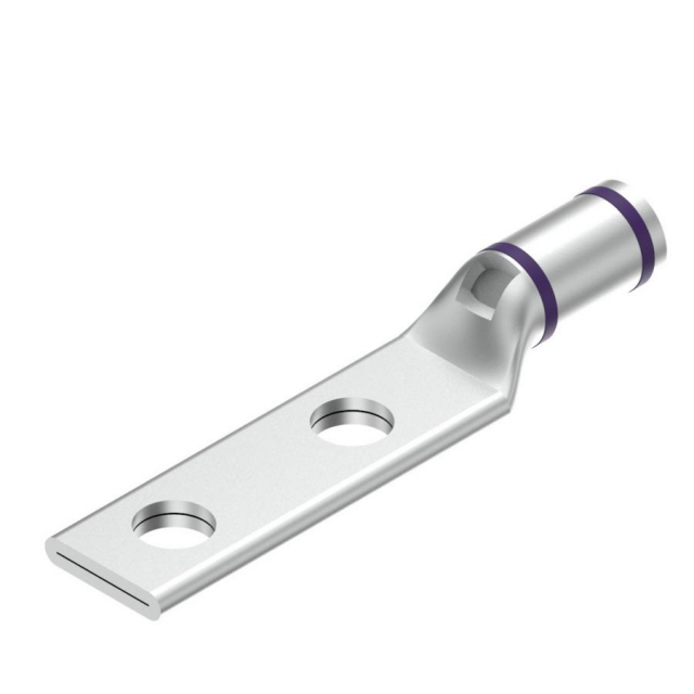Copper Compression Lug, 2 Hole w/ Inspection Window, 4/0 Flex, 1/4" Stud, 5/8" Stud Hole Spacing, Short Barrel, Tin Plated.