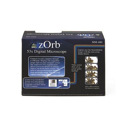 The MM-480 zOrb is a digital microscope with an integrated camera that displays the magnified image right on your computer screen. The impressive 65x Magnification (21" monitor) allows you to see details of ordinary objects you never knew existed! The built-in internal illuminator ensures a clear and bright image.