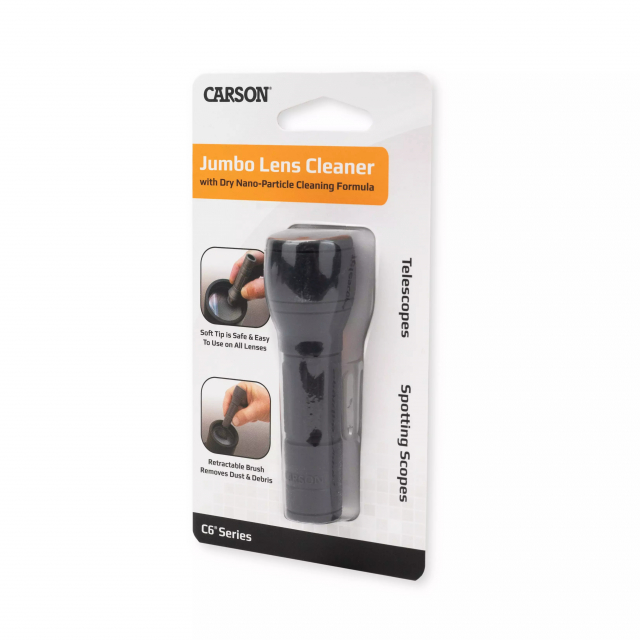 Whether you're trying to get a clear view of the stars with a telescope or simply want clear vision through your spotting scope, a lens cleaner can help. The Reusable Jumbo Lens Cleaner Pen is a portable lens cleaner that is perfect for ensuring your Carson products retain their high quality and maintain peak performance. The C6® Jumbo Lens Cleaner Pen utilizes a Dry Nano Particle Cleaning formula that provides protection from dust, fingerprints, and smudges on any lenses, with effective and long-lasting results. This cleaning solution is alcohol free & ammonia-free, making it entirely safe for use.