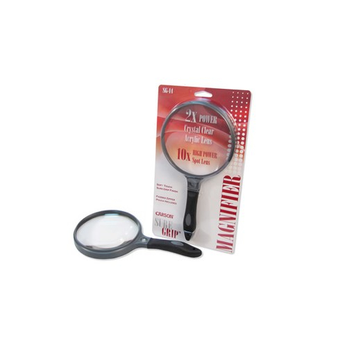The SG-14, SureGrip™ has one of the largest viewing areas of any handheld magnifier. The 2x, crystal clear acrylic lens makes it a lightweight alternative to traditional glass magnifying lenses. Our ergonomic, SureGrip™ handle makes gripping easy. The SG-14 is perfect for reading scorecards, directories, recipes or for anyone who needs a wider viewing area. The 2x power primary lens is a full 5” (130mm) with a built-in 10x spot magnifying lens for viewing even the smallest of details. Includes a soft zippered case for protection between uses.