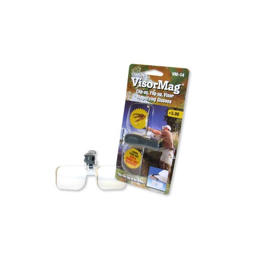 The VM-14 VisorMag™ from Carson Optical is a set of clip-on, flip-up magnifying glasses that attach to the brim of most caps and hats. Perfect for fly-tying and all fly-fishing needs. Complete with protective soft-pouch, its crystal clear acrylic Lenses give you a sharp, distortion-free view that allows you to see even the finest details with ease. These Magnifying glasses are 2.25x power equivalent to +5.00 diopter.