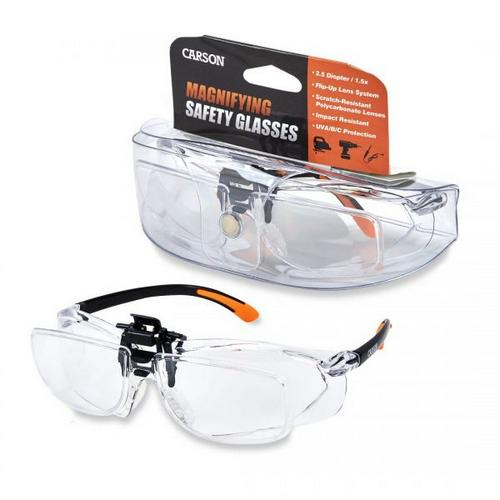 Carson’s Magnifying Safety Glasses are 1.5x/2.5 diopter. They feature a flip-up lens system for convenient use. The scratch-resistant poly carbonate lenses ensure long time use. They are impact resistant and feature UVA/B/C protection. Great for hobbies & crafts where eye protection and magnification is needed.