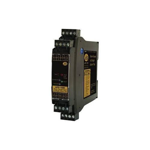 The APD 1500 D accept a strain gauge, bridge, or load cell input and provide a visual alarm indication and alarm relay contact outputs. The input is factory configured to a specific excitation voltage and millivolt input range. The input can be configured as zero-based (i.e., 0 to 20 mV), bipolar (i.e., -30 to +30 mV) for push-pull applications, or offset (i.e., 5 to 33 mV) to electronically compensate for deadweights (tare). The alarm types are factory configured. Front-accessible potentiometers are used to adjust alarm setpoint and deadband.