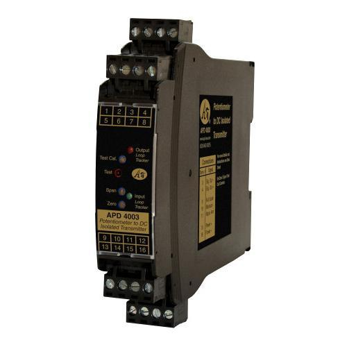 The APD 4003 D accepts a resistance input from potentiometer, slidewire, linear position, displacement, or rotational devices and provides an optically isolated DC voltage or current output that is linearly related to the potentiometer position.