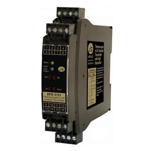 The APD 4131 accepts a thermocouple temperature input and provides an optically isolated and linearized DC voltage or current output.