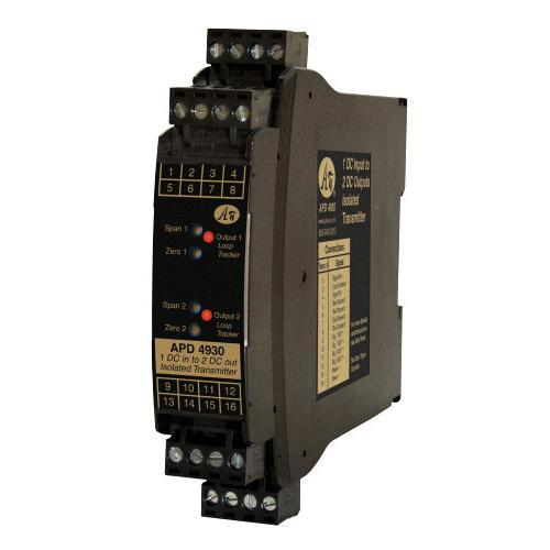 The APD 4930 IsoSplitter accepts a DC voltage or current input and provides two optically isolated DC voltage or current outputs that are linearly related to the input. The input range and each output range are independent and can be specified as required. This provides an economical solution when one signal must be sent to two different devices.