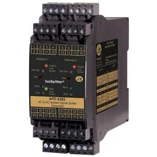 The APD 6393 D IsoSplitter accepts an AC voltage or current input and provides two optically isolated DC voltage or current outputs that are linearly related to the input. The input range and each output range are independent and can be specified as required. This provides an economical solution when one signal must be sent to two different devices.