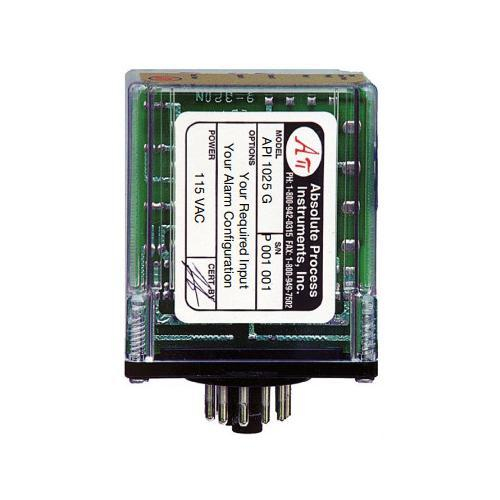 The API 1025 G contains two independent setpoints with two SPDT relay contact outputs. The normal acting alarm output can be factory configured for HI/HI, HI/LO, LO/HI or LO/LO operation. Top-accessible potentiometers are used to adjust each alarm setpoint. Deadband is fixed at 1% of span. Adjustable deadbands are optional.