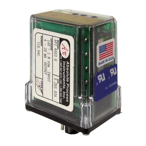 The API 4003 G I accepts a resistance input from potentiometer, slidewire, linear position, displacement, or rotational devices and provides an optically isolated DC voltage or current output that is linearly related to the potentiometer position.