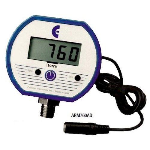 Cecomp Series ARM760BBL Absolute reference gauges read zero at full vacuum and atmospheric pressure with the gauge port open. With the gauge port open, it is normal for the reading to constantly change in response to atmospheric pressure changes. ARM760ADBL model are designed for applications where a continuous display of vacuum is required such as monitoring vacuum systems and pumps. Series ARM760BBL Gauge are factory calibrated using NIST traceable calibration equipment. Calibration is not required before using the gauge. 3 readings per second nominal display update rate, Red LED display backlight on when gauge is on.