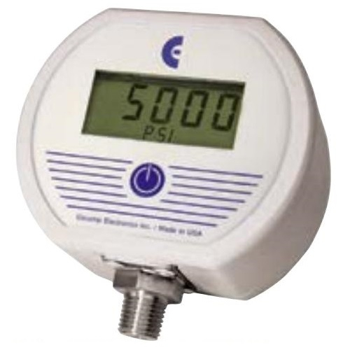 Cecomp Battery Powered Digital Pressure Gauge Series F4B. UV stabilized ABS/polycarbonate case, polycarbonate display window, polycarbonate front label, rear gasket, six stainless steel cover screws. NEMA 4X, not intended for permanent outdoor installations. Resolution is fixed and limited by number of display digits. 3 readings per second nominal display update rate. 1/4" NPT male fitting, 316L stainless steel. All wetted parts are 316L stainless steel.