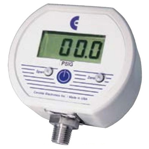 Cecomp Battery Powered Digital Pressure Gauge Series F4B. UV stabilized ABS/polycarbonate case, polycarbonate display window, polycarbonate front label, rear gasket, six stainless steel cover screws. NEMA 4X, not intended for permanent outdoor installations. Resolution is fixed and limited by number of display digits. 3 readings per second nominal display update rate. 1/4" NPT male fitting, 316L stainless steel. All wetted parts are 316L stainless steel.