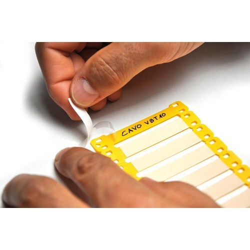 For attachment by cable ties to pipes, conduits and cables with larger diameters. A permanent marker is used to hand-write data on the tag over which an adhesive, transparent film is applied for protection.