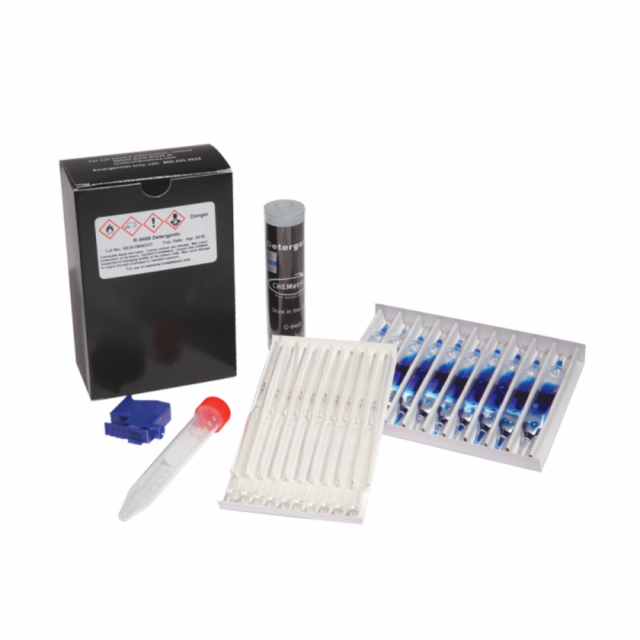 Chemetrics, K-9400, Detergents (anionic surfactants, MBAS) - CHEMets Visual KitDetergents (MBAS) test kit K-9400 comes in a cardboard box and contains everything needed to perform 20 tests.