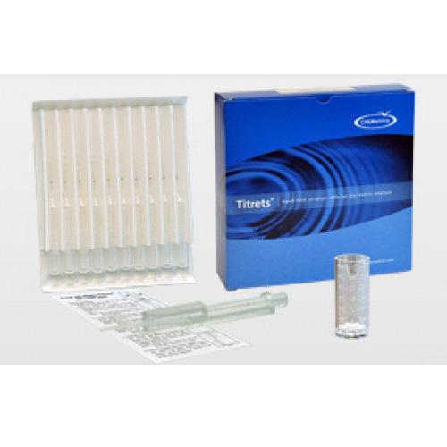 Kit comes in a cardboard box and contains everything needed to perform 30 tests: thirty ampoules with valve assemblies, Activator Solution, titrettor, 25 mL sample cup, and instructions.