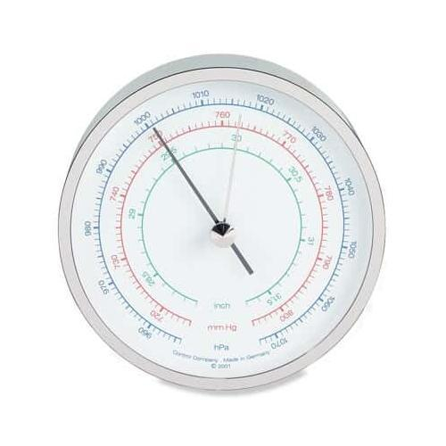 Three-Scale dial barometer measures atmospheric pressure in millibar (mbar), inches Hg and mm Hg. The barometer is housed in corrosion-proof nickel-chrome case. Set the adjustable pointer to measure changes in pressure. Barometers are calibrated to NIST-traceable standards and include certificate. Measures 1.3"D x 4" dia.