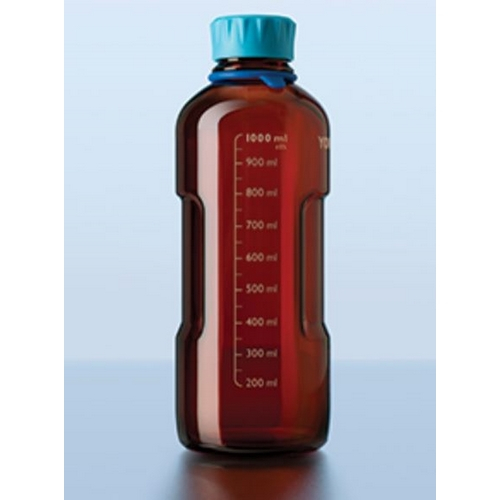 Bottle with cyan screw-cap and pouring ring. Made from 3.3 borosilicate glass. Features a specially shaped gripping zone on both sides of the bottle to permit easier and safer handling. A pre-defined labeling area is compatible with the dedicated self-adhesive YOUTILITY bottle labels. Colorful bottle tags can easily and securely be attached around the neck of the bottle for indiviualized identification.