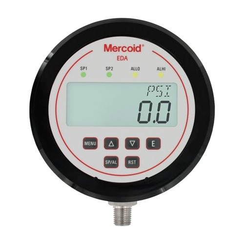 Series EDA Electronic Pressure Control is an extremely versatile compact package that can replace a separate gage, two switches, and a transmitter in a system saving money, installation time, and panel space. The EDA incorporates two SPDT relays that have the on and off points fully adjustable over the range for control or alarm use. Front face has LED indicators for switch status and a large backlight two-line display showing process value and indication units. Programming is easy with simple menu structure, two-line display, and external programming buttons. Weatherproof housing is ideal for a wide variety of applications with panel mount, flush mount, or pipe mount ability.