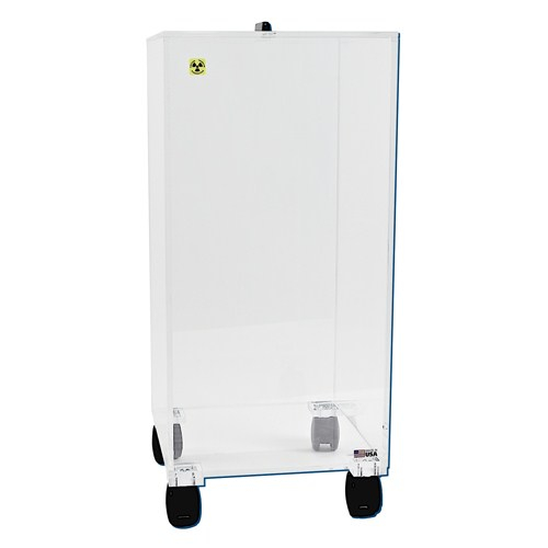 Extra large capacity storage bins hold carboys, linens, bench liners, etc. Units come with four heavy duty casters for complete portability. Full shielding from Beta emitters keeps personnel safe during transports. Supplied complete with radiation warning labels and with one liner bag