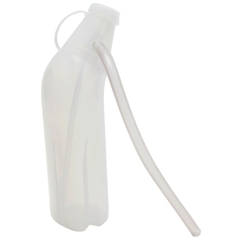 The head has an air-vent valve to assure air refill of free space in the bottle thus preventing drawback of contaminated wash into the bottle. A perforated spray plate in the eye-cup breaks up the stream to give the eye a gentle wash. A drain tube releases used fluid. Maximum comfort and ease of use. Capacity of bottle is 500 ml (16 oz.)