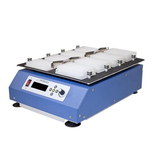 Eberbach's large capacity Microplate Vortex Mixer is designed to produce vortex mixing of aqueous solutions in standard and deep well micro-titer plates. The top plate moves in a tight 0.125" orbit at speeds between 120 and 2200 rpm. Built in clamps hold 8 deep well titer plates or 16 standard plates. Control interface includes a digital programmable timer with digital tachometer which allows timed protocols or the shaker may be run continuously. This vortexer also includes rubber feet to prevent creeping.