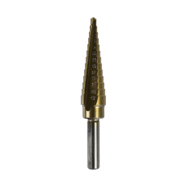 The 13 Step Drill Bit, 1/8" - 1/2" can be used on thin materials such as sheet metal, plastic, or even wood.