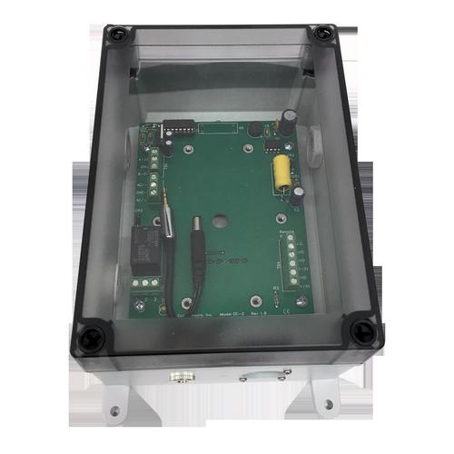 Everything in the enclosure is powered by 12-16 VDC or, as an option, 24 VAC or DC. Other options are a relay to control external equipment, a 4-20 mA signal loop output, and an enclosure interior heater. Wiring to external equipment is via a semi-sealing side gland.