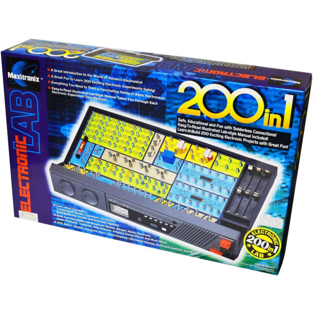 Learn about transistors, transformers, diodes, capacitors, oscillators, basic electronic circuits, and schematic symbols with the 200-In-One Electronic Project Lab. Easy-to-read, illustrated, lab-style manual included.