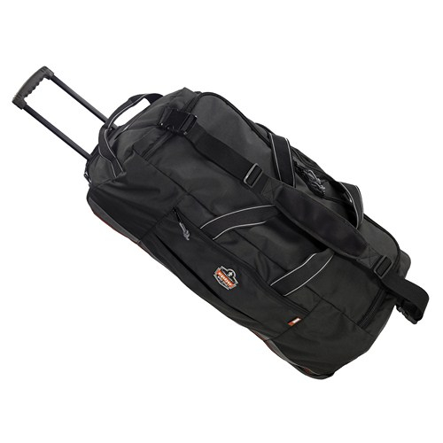 Largest capacity bag. Includes telescoping pull handle and wheels