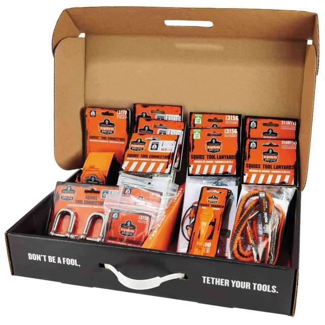 The kit contains product solutions for tethering ratchets, scaffolding and adjustable wrenches, mallets, hammers, tape measures, scaffolding keys, levels, gloves and hard hats.