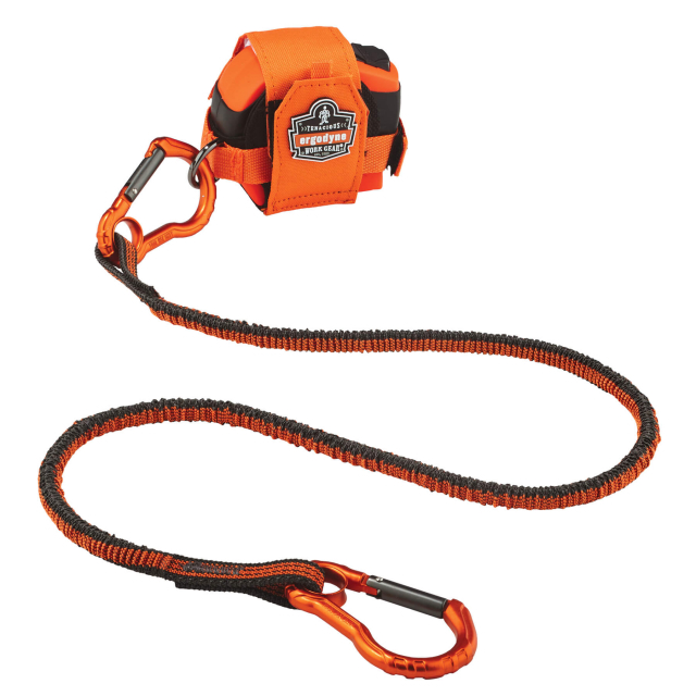 Shock absorbing tool lanyard with carabiner on both ends: Designed and tested to prevent falling objects and reduce the force your body sees if a drop occurs by absorbing the energy transmitted through the tool lanyard. By reducing the shock load this design prevents the tool from pulling the user down with it protecting those above as well as those below.