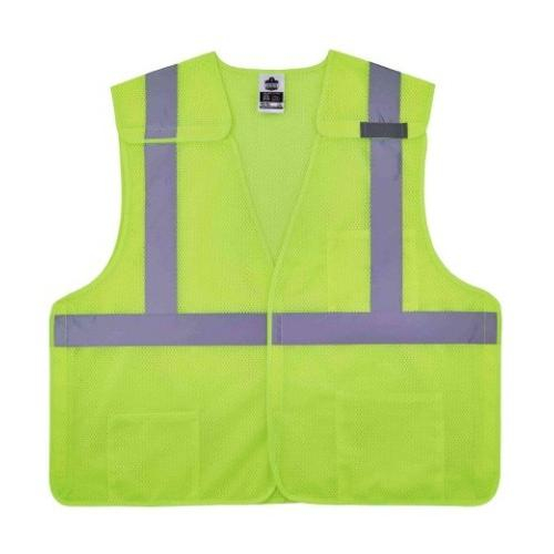 The GloWear 8217BA Class 2 Hi-Vis 5-Point Breakaway Safety Vest is built with durable yet breathable ANSI/ISEA compliant polyester mesh and a 5-point breakaway design, for maximum visibility and protection against being caught in moving industrial equipment. This 5-point breakaway vest (shoulders, sides and front) is designed to harmlessly break away from the body in the event of mechanical entanglement. The rugged, durable 100% polyester offers resistance in tough working conditions with the strength to support extra weight in the cargo pockets. This high visibility safety vest has a total of three strategically placed pockets. The open-top pocket on the lower right exterior is designed to carry tools, gloves, notebooks, etc. Two interior pockets, one upper left, flap open-top, and one lower left pocket, are great for field books, tape, pencils, cell phones, etc. Other features include an upper left mic tab, which can also be used to hold safety glasses/sunglasses or pens, and 2 " ANSI-compliant reflective tape for maximum visibility both day and night. This reflective safety vest is ideal for flaggers, airport baggage handlers and ground crew, road construction workers, forestry workers, high-volume parking attendants, toll-gate personnel, utility workers, shipyard workers, municipalities workers, and anywhere high-visibility clothing and apparel is necessary.
