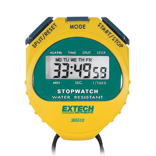 The Extech 365510 is a digital stopwatch and clock. This sporty, yellow stopwatch has a water-resistant housing, accumulated elapsed time and split time measurements and two competitors monitoring. The stopwatch/ clock also features a wake/snooze alarm function. Complete with 39" (1m) neck strap and battery.